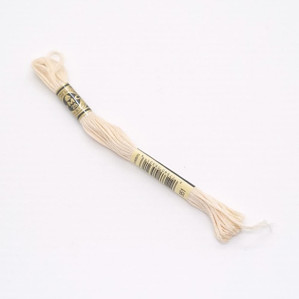 糸は6本に分かれた撚り糸から出来ており、使用する撚り糸の本数を変えることで、色の濃さや密度を調整することができます。糸を取り分けるには、まずカセの中から糸の端を見つけ、18インチ(45センチ)ぐらいになるまでゆっくりと引っ張りカットします。糸を別々の撚り糸に分けるには撚り糸の1本を残りの糸から完全に離れるまでゆっくり引き抜きます。続けてステッチに必要な本数分を引き抜きます。糸を再び撚り合わせるには、糸の端を合わせて持ち、全体が均一になるようにやさしくなで合わせてまとめます。