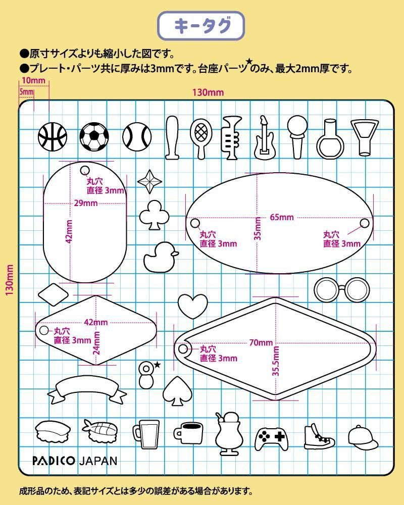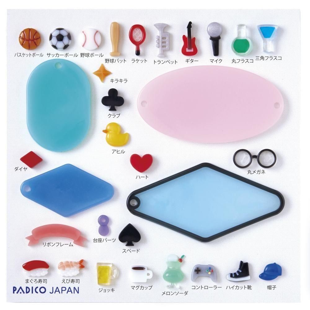 ・楕円やひし形などのプレート4種類とスポーツや楽器などのパーツ27種類