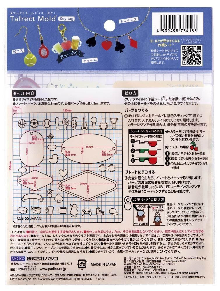 <ご注意>●形状上、ゆがみが発生する場合があります。●コーティングレジンを使用した場合、通常のレジンより硬く仕上がります。バリを除去する際はケガをしないよう十分にご注意ください。また、除去したバリは、すぐにゴミ箱に廃棄してください。●制作した作品は小さいため、そのまま放置しないでください。誤飲や踏んだりしてケガをする恐れがあります。●本モールドは、レジンや粘土などのクラフト専用です。食品など他の用途には使用しないでください。ご使用後は中性洗剤などで優しく洗い、乾燥後は子供やペットの手の届かない場所に保管してください。●直射日光や火のそばに置かないでください。変形・変質の原因になります。●作品をモールドから外す時は、レジンの硬化熱が冷めてから外してください。●モールドを熱いまま何十回も繰り返し制作すると、表面が曇ったり変形する恐れがあります。●電子レンジ、オーブンでの使用はできません。●材質の特性上、細かな傷がついていることがあります。あらかじめご了承ください。●溶剤やオイルは使用しないでください。劣化や曇りの原因になります。●傷つきやすいので、金属ベラやカッターなどは使用しないでください。