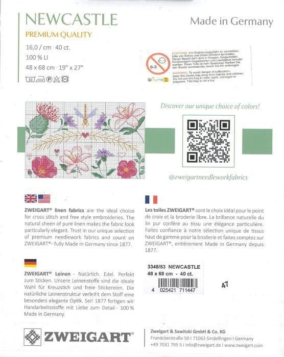 ツバイガルト社ニューカッスルは、様々な刺しゅうに最適な平織りのリネン生地です。
